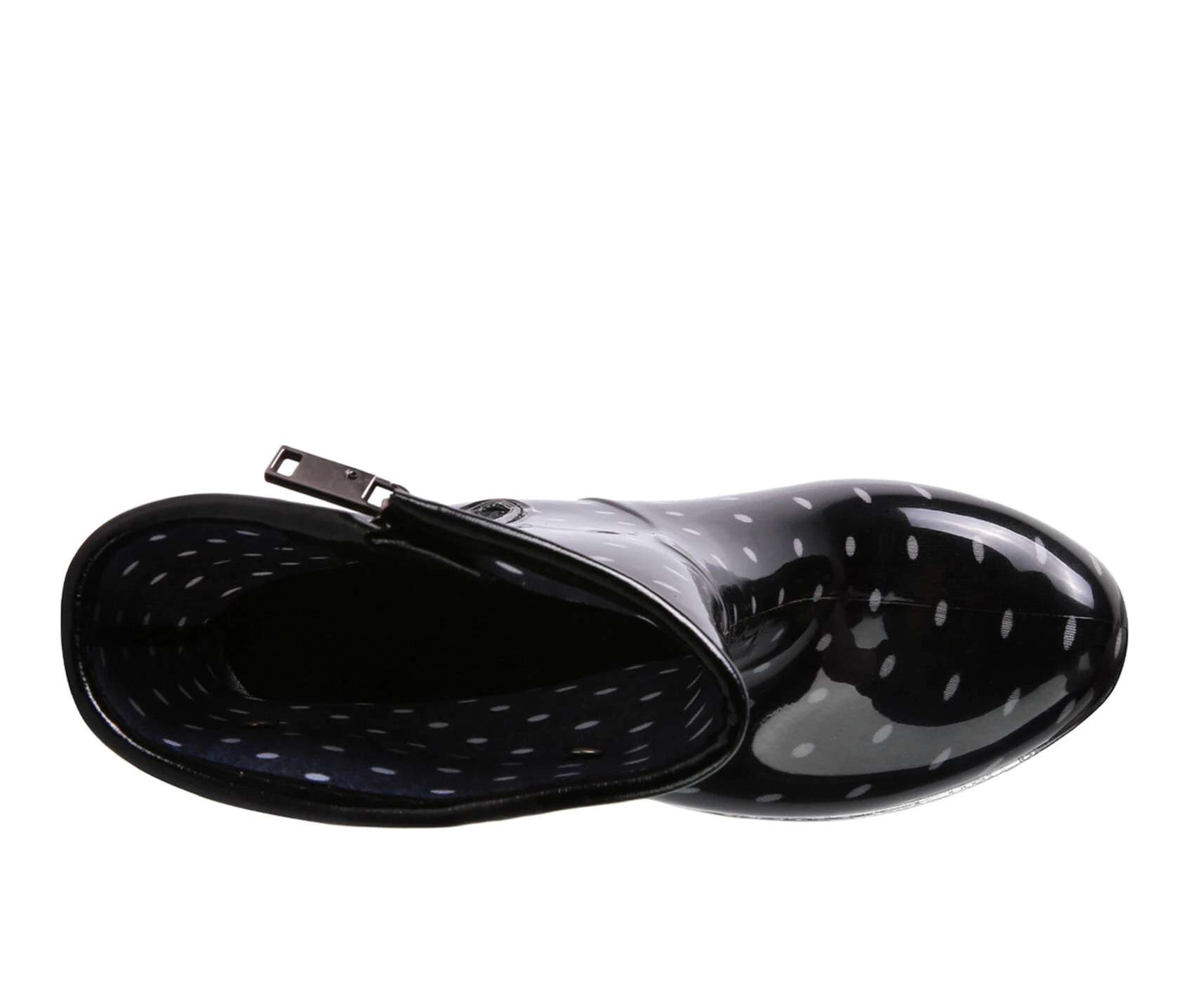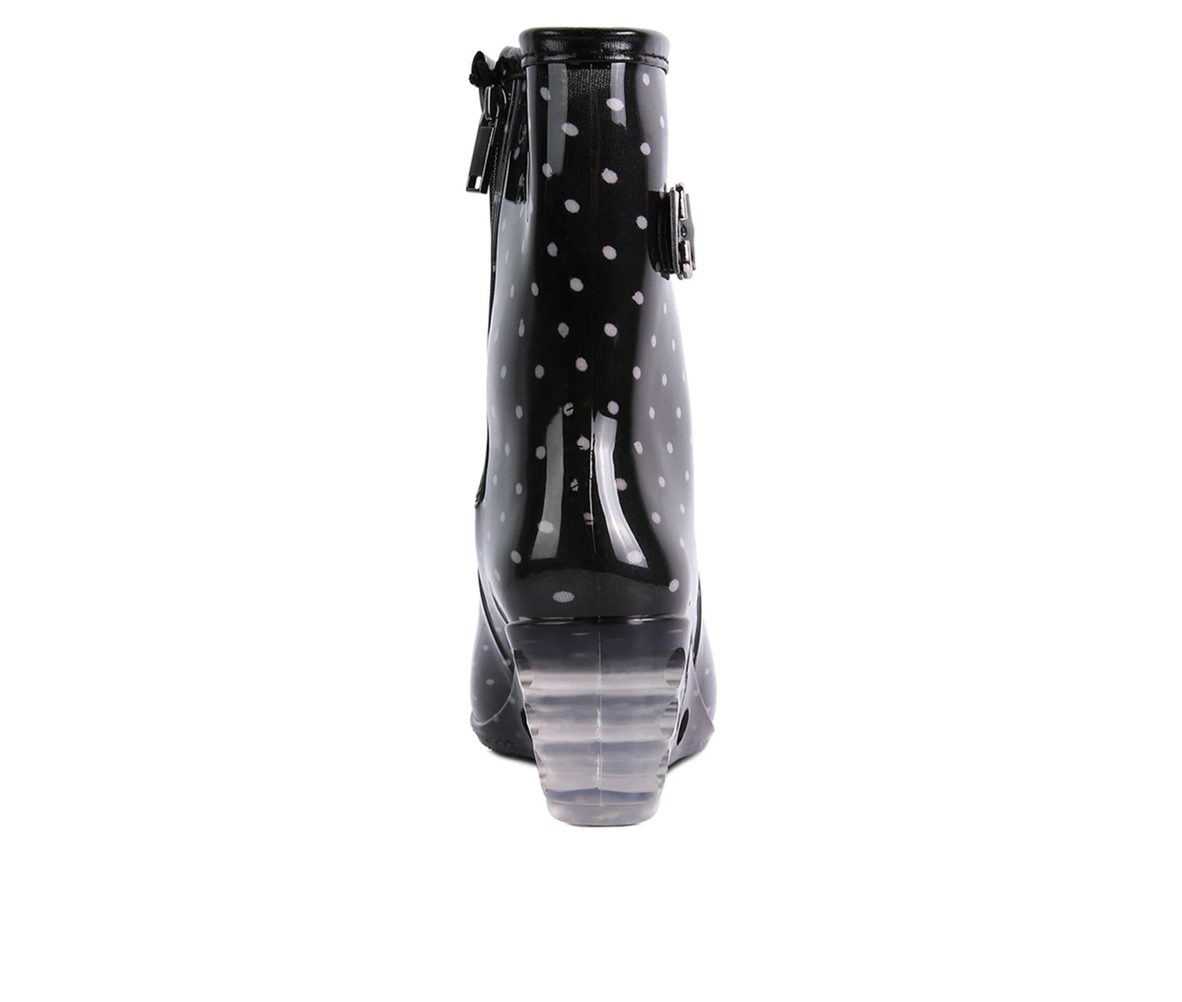 - These calf-high rain boots are to make your monsoons brighter. The print is a cute touch and the buckle and chain make them stylish. It has a zipper detail which makes it easy to wear and remove. The clear wedge heel looks beautiful and keeps it glam.